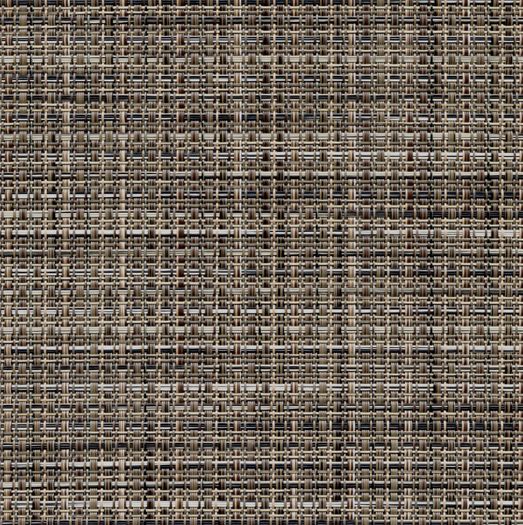 Phifertex Cane Wicker in Gannon Mocha, a dark neutral sling chair fabric with a blend of tans, blacks and browns, brings a sleek and textural spin to traditional wicker in a long-lasting vinyl-coated polyester yarn. This outdoor fabric is built to last and is ideal for outdoor lawn and patio sling furniture.